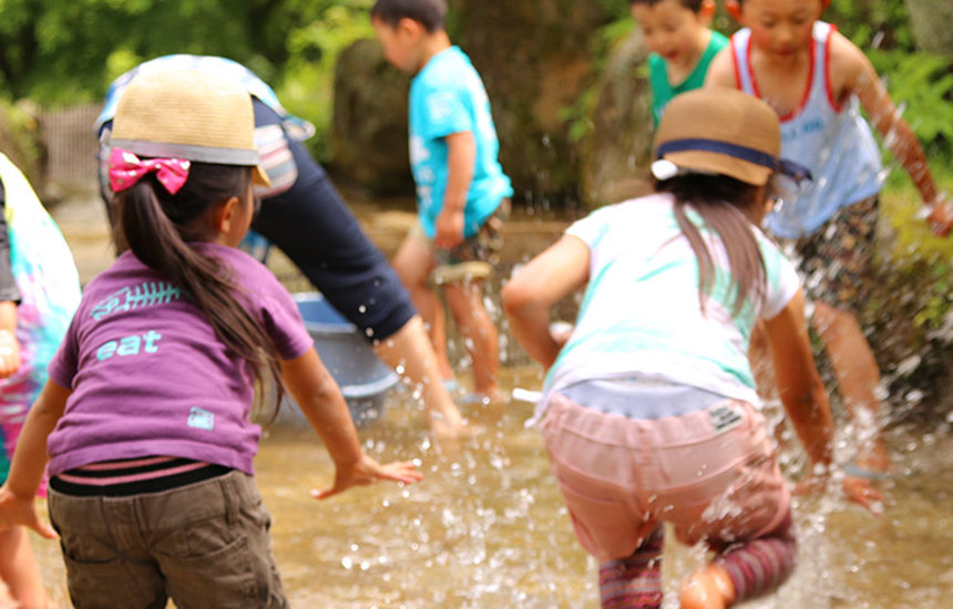 エントランスからすぐの駐車場付近には透き通った川が流れ、夏になると子どもの川遊びができるようになっています。浮き輪をもって浮かぶ小さな子どもも、小学生高学年ほどの子ども楽しめるため、まるで森林の海水浴とでも呼びたくなるような光景が広がります。