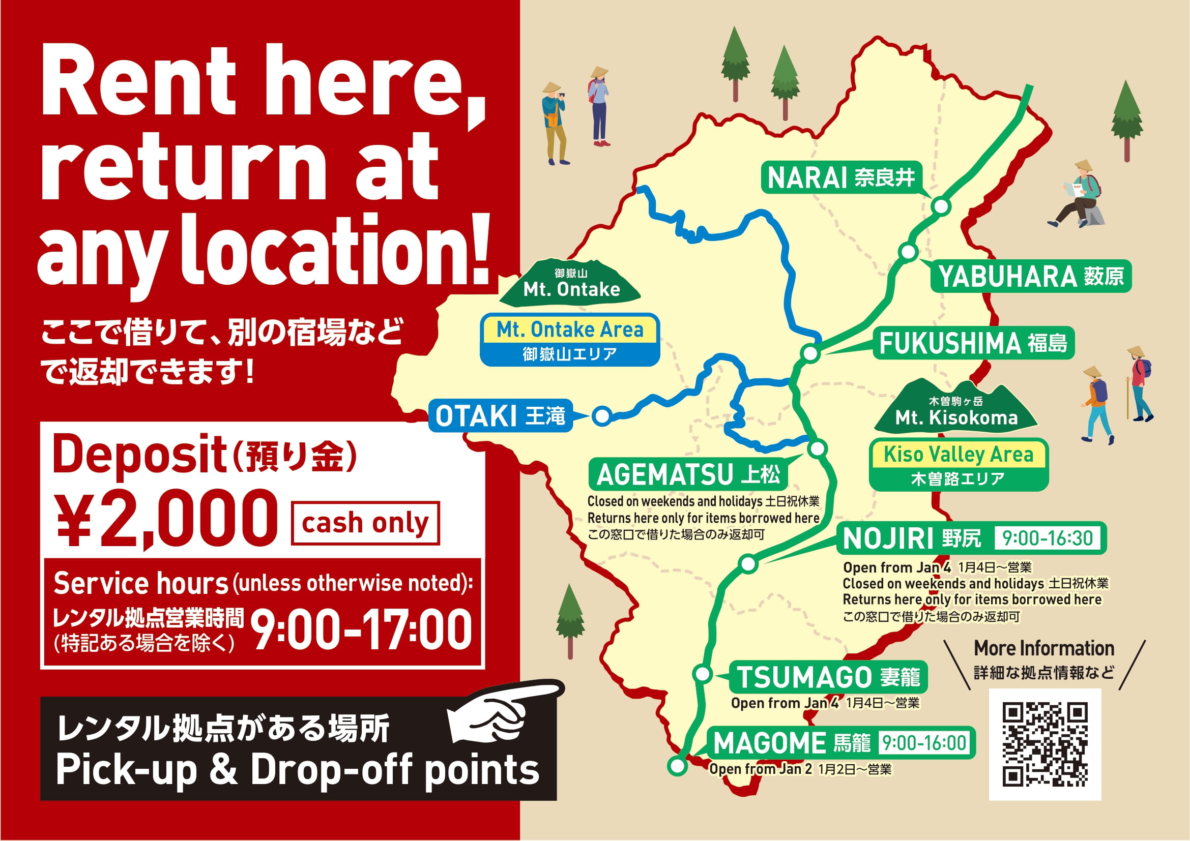 街道沿いのお好きな場所で借りて、お好きな場所で返せます。※上松宿・野尻宿での返却は、同じ窓口で借りた場合のみ。