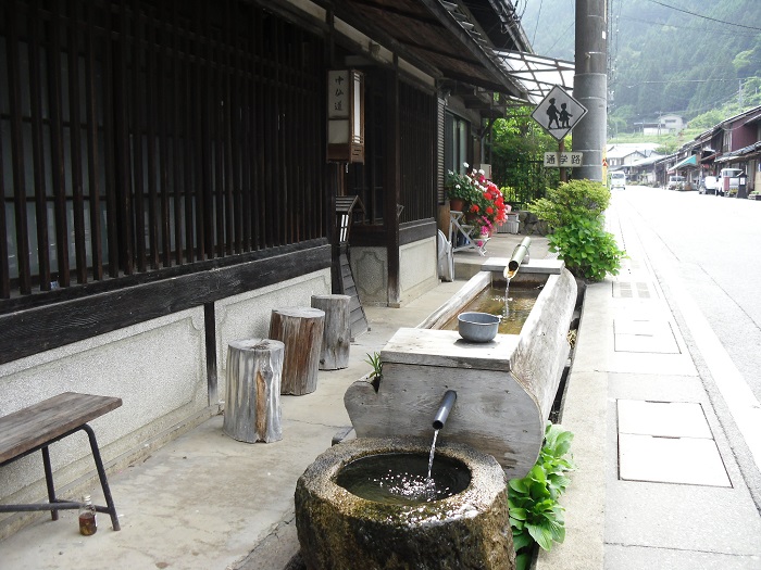 清水が湧く宿場町として軒先には丸太をくりぬいた水船が置かれ、野菜や果物を浮かべる情緒豊かな光景が昔を今に伝えています。