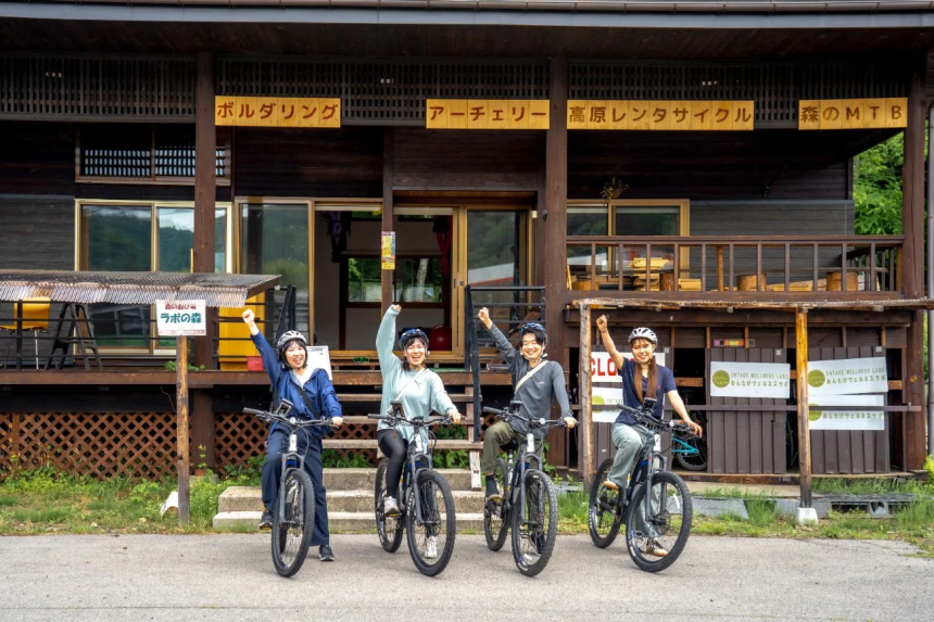 おんたけウェルネスラボにクルマを停めて、E-バイク(電気アシスト自転車)をレンタルして乗り換えます。E-バイクは、人がペダルをこぐ力をモーターが補助する自転車で、坂道でもらくらくと登れます。