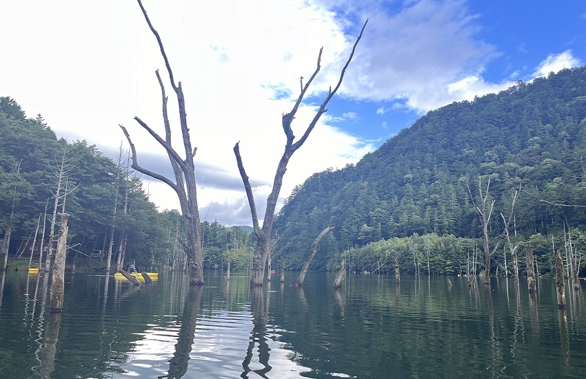 自然の力で生まれた自然湖。年月が経ち景色も変化し、立ち枯れの木は少なくなっています。自然災害で生まれた歴史を目の当たりにし、自然の力強さを知ることができます。