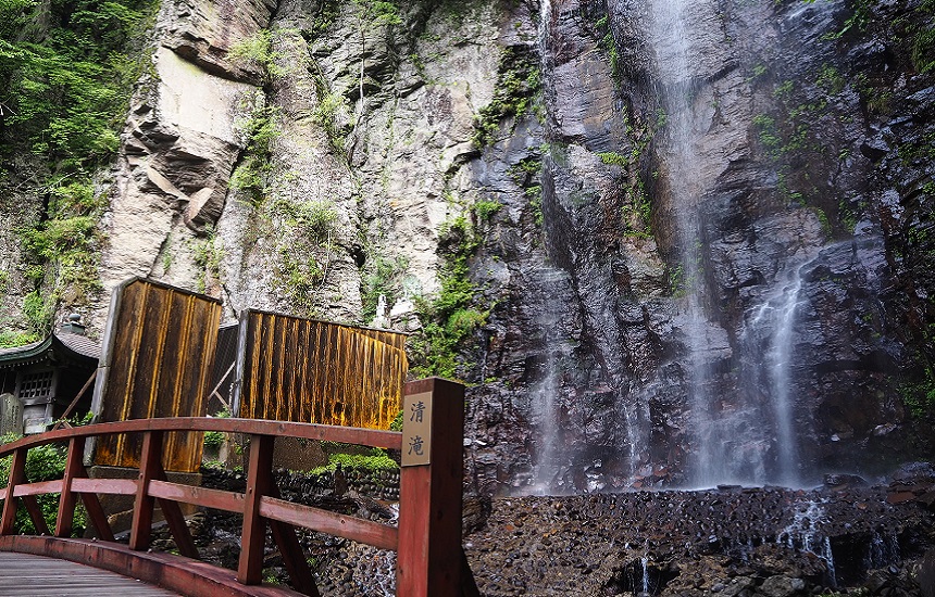 新滝の下流にある清滝。御嶽山に登る前に100日籠り、滝行で身を清めた場所と言われています。現在も滝の隣に更衣室があり滝行に訪れる人が絶えません。真冬には氷柱が出現し、幻想的な光景が見られます。