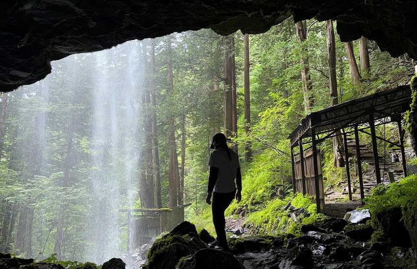 裏側からも滝を見ることのできる新滝は「裏見滝」とも呼ばれています。滝行に訪れた信者は裏のくぼみの中に籠り修行を行っていたと言われています。垂直に落ちる滝は冬になると繊細な氷柱が出現します。