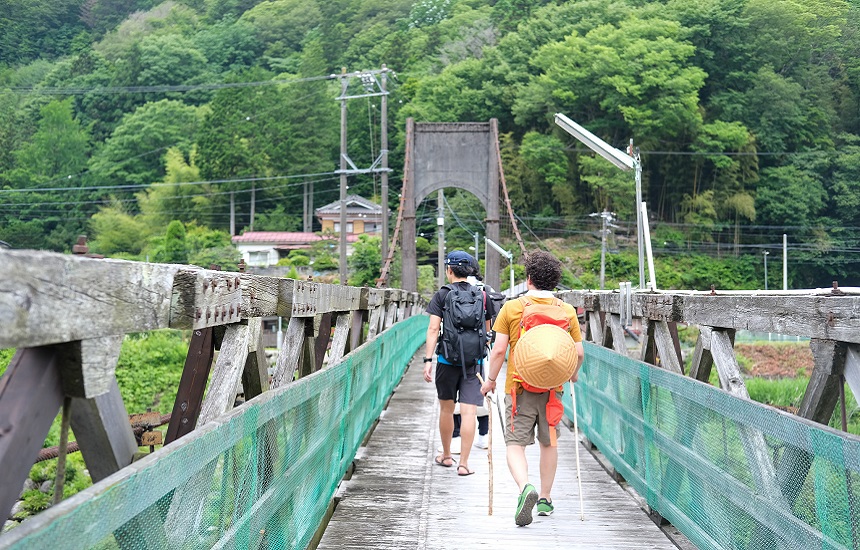 倉本駅を過ぎてすぐの場所にあるのが、車は通れない吊り橋。床や欄干が木造で、数人で通ると揺れも増してギシギシと音を立てます。ここ諸原橋は、集落と集落を結ぶ地元住民のための橋です。