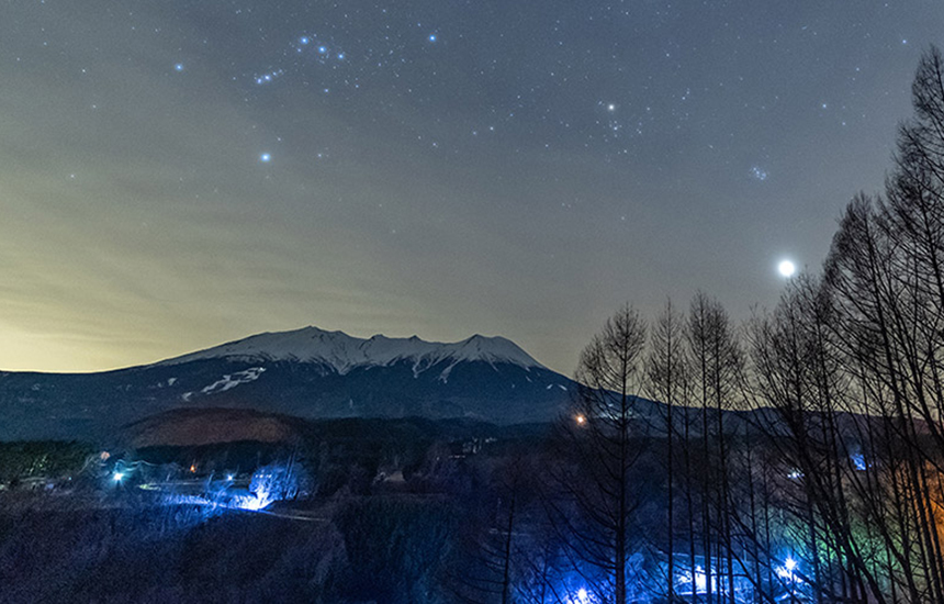 呼吸をするたび鼻の奥にツンと感じる冷たい風。木曽の美しく澄んだ冬の空気は、月や星をより美しく見せてくれます。宿場町の趣ある町並みで、遮るものがなにもない大自然のなかで、しんしんと降り積もる雪景色のなかで……。木曽の旅の途中、ふと夜空を見上げると目に映る満天の星は、はるか昔にこの地に生きた人々が見た景色かもしれません。そんなロマンを感じさせる木曽の夜空を眺めていると、時間が経つのも忘れてしまいそうです。